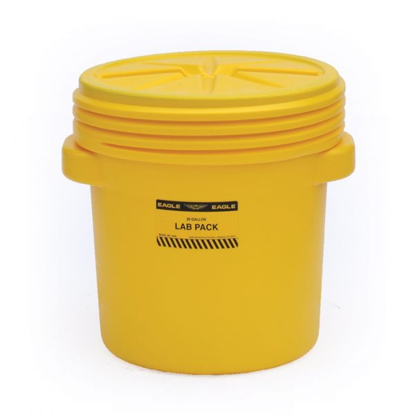Eagle Lab Pack -rummut on valmistettu keltaiseksi puhallusmuovatusta HDPE-polyeteenistä, jossa on UV-inhibiittoreita, ne ovat kestäviä ja kevyitä, sään ja kemikaalien kestäviä ja ruuvattava kansi. Ihanteellinen vaarallisten aineiden turvalliseen varastointiin, käsittelyyn ja kuljetukseen, roiskeiden torjuntaan ja vaarallisten aineiden puhdistukseen, Jäteastia tupakalle -rahtikonttiin, biojätteen hävittämiseen ja polttamiseen. Laboratoriopakkaukset/avopäätynnyrit – käytettäväksi pienempien vahingoittumattomien pullojen, tölkkien, tölkkien ja 5 gallonan ämpärien kanssa, joissa on ei-vuotavia vaarallisia materiaaleja.