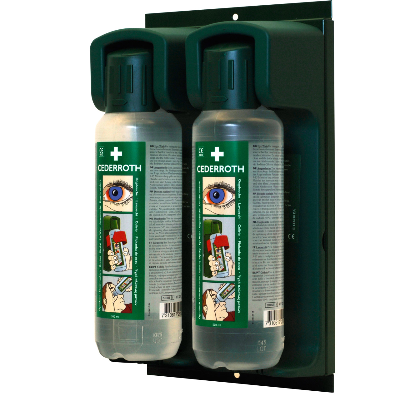 Seinäteline on suunniteltu 2 kpl Cederroth silmänhuuhdepullolle (500 ml). Telineen mukana tulee jälkivalaiseva käyttöopaste. Erikseen saatavilla myös näkyvyyttä lisäävä kyltti.