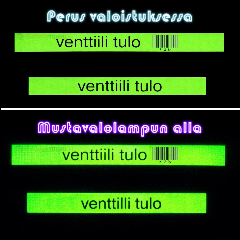 Mustavalolampun hohtava fluoroscent väri, erittäin näkyvä nauha putkistomerkintöihin yms.