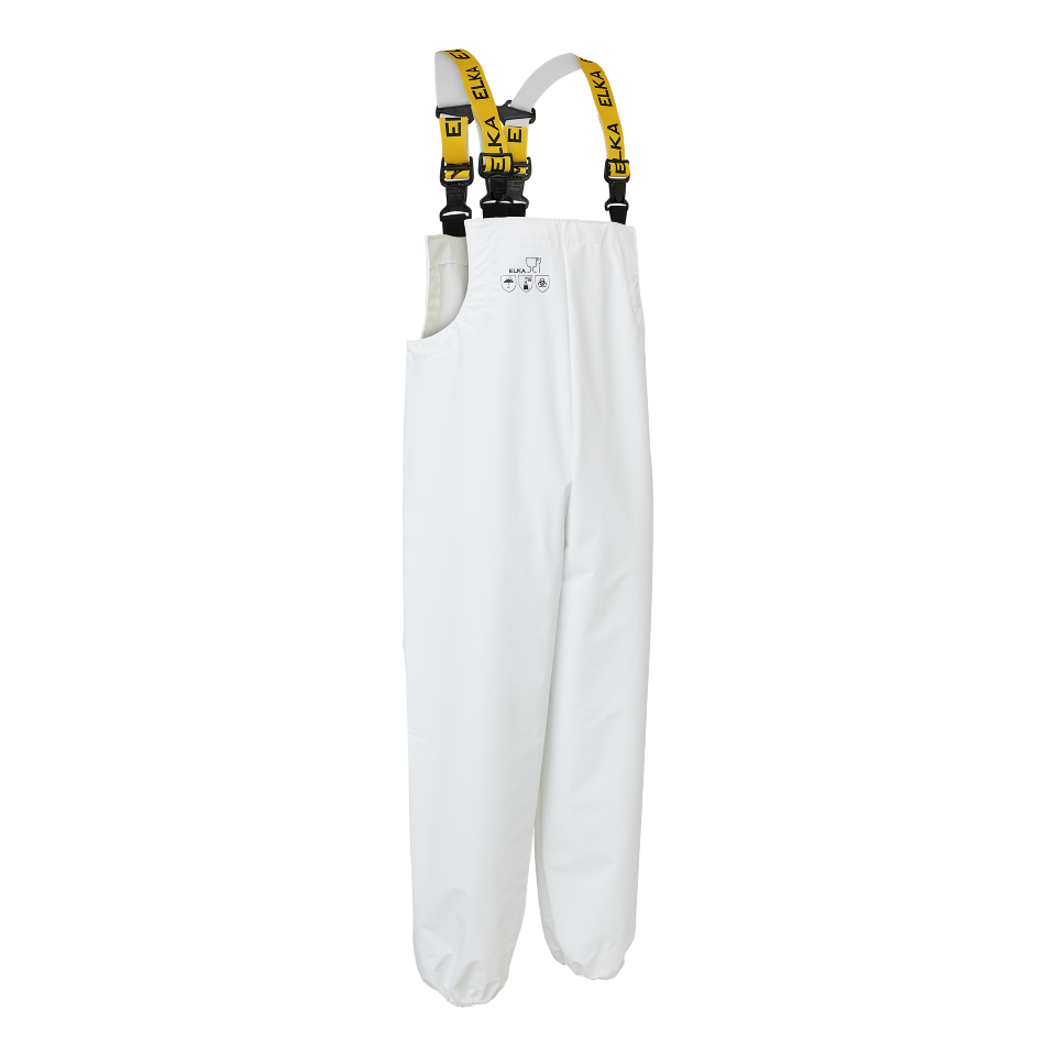 ELKA FOOD Bib & Brace G&F on elintarviketeollisuuteen suunniteltu bib & brace -mallinen työhaalari kosteisiin ja vaativiin työolosuhteisiin. Vedenpitävä ja kestävä materiaali suojaa tehokkaasti roiskeilta ja on helppo puhdistaa, mikä tukee hygieenistä työskentelyä.