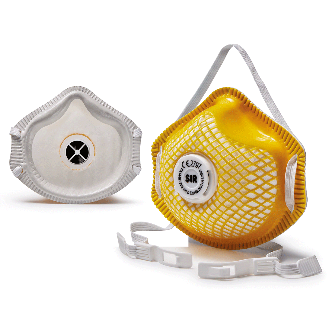 Kertakäyttöinen hengityssuojain, jossa on uloshengitysventtiili. Sopii