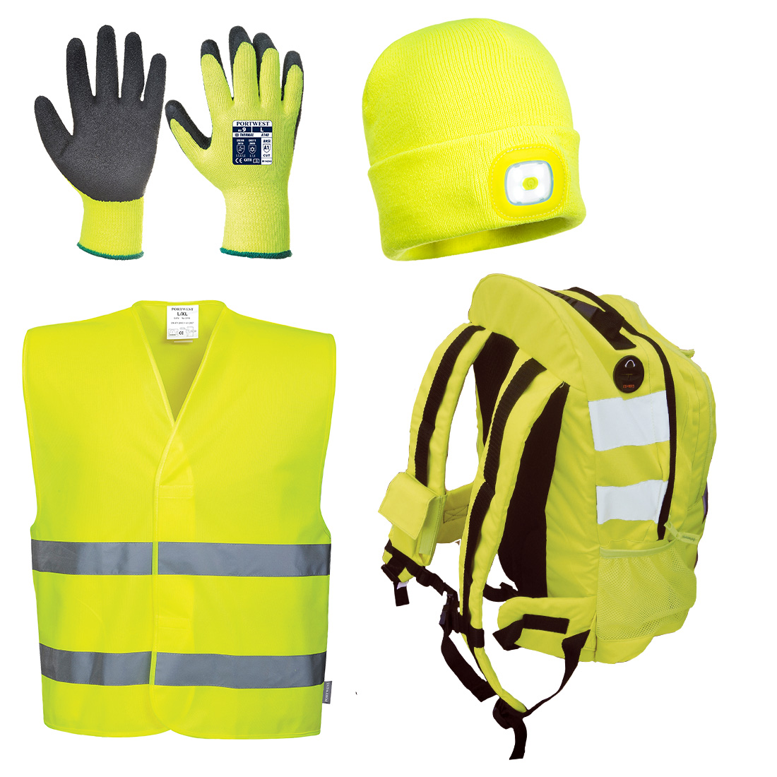 Pysy turvassa ja näy. Portwest HiVi-s Kit -tuotepaketti sisältää kaikki olennaiset tarvikkeet näkymiseen:- A140 Hi-Vis hanskat (3pr)- C474 Hi-Vis Heijastinliivin- B905 Hi-Vis laukun- B028 Hi-Vis LED-valopipon