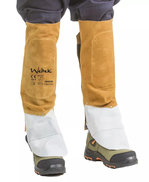 1,4 mm:n paksuisesta nahasta valmistetut, 36 cm korkeat säärystimet peittävät hitsaajan kengät ja housun lahkeet. Nopea ja helppo kiinnitys.