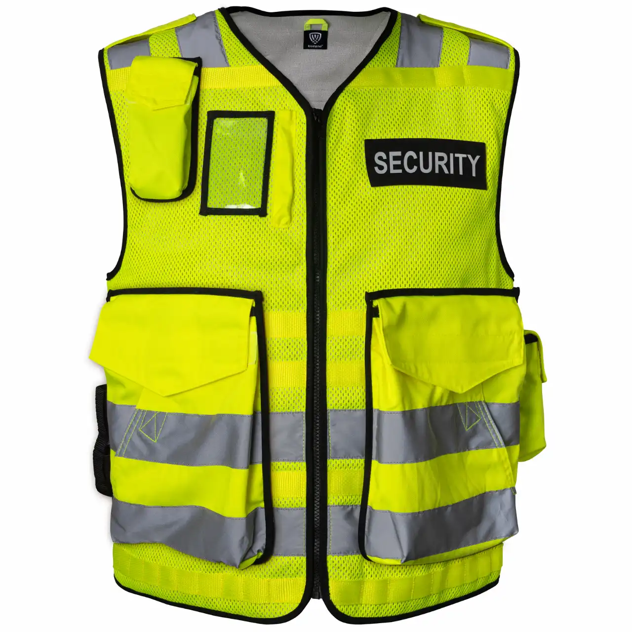 Huomiovärinen taktinen liivi, joka suojaa viilloilta ja pistoilta.