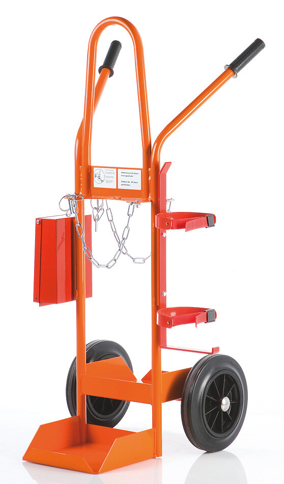 Suomessa valmistettu laadukas kaasupullokärry kahdelle 20 litran kaasupullolle. 2021 sammutintelineellä ja palohanskalaatikolla,