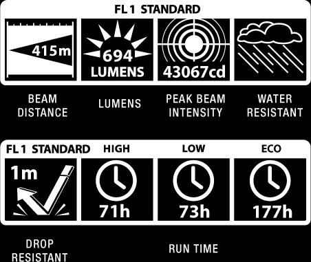Suorituskyky ANSI FL1 standardin mukaisesti: Valon kantama 415 m, valovirta 694 lumenia, valon voimakkuus 43067 candelaa. Paloaika Full Power asetuksella 71 h, Low Power asetuksella 73 h ja Eco asetuksella 177 h (joiden jälkeen on vielä 10% alkuperäisestä valon voimakkuudesta jäljellä. Roiskevesitiivis IPX4. Iskunkestävä 1 m.