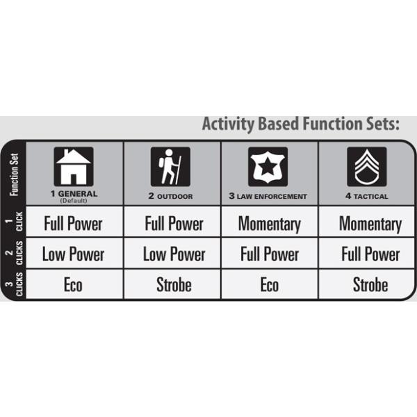 General -yleiskäyttöasento on valaisimessa esiasetettuna, ja sen toiminnot ANSI FL1 standardin mukaisesti: