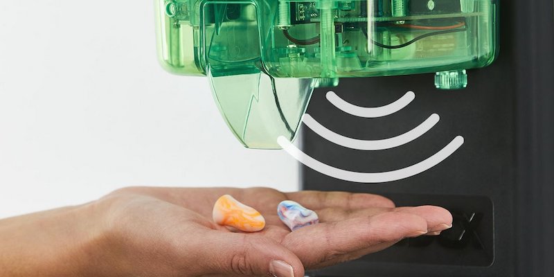 Touch free automaattipakkaus, jossa 500 paria Moldexin Spark Plugs -korvatulppia. Anturiohjattu, täysin hygieeninen.