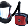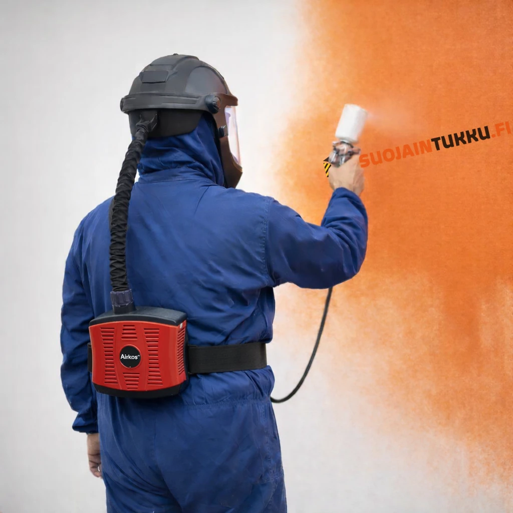 Täydellinen valmispakkaus: Mukana laukku, suodatin P3, letku, laturi, akku, kasvo-osa ja vyö.