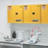 Kaapin sinkityt teräshyllyt keräävät valuneen ylijäämänesteen ja ohjaavat sen vuotamattomaan valuma-altaaseen pohjalla. Kaappi on myös eristetty tulipaloilta ja siinä on lisäksi liekkisuojatut tuplaventtiilit ja maadoitusliitin.
