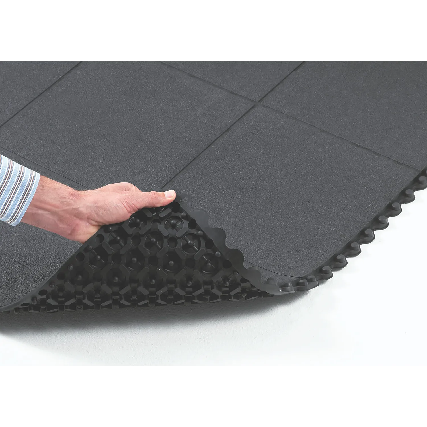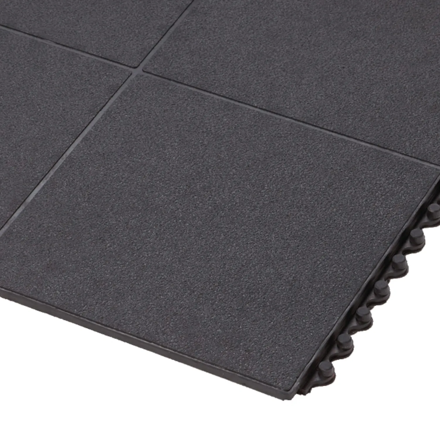 Raskaan käytön 91 cm x 91 cm kumilaatat voidaan helposti koota suurten alueiden tai yksittäisten työpisteiden kattamiseen, seinästä seinään tai erillisiksi alueiksi. Ergonominen hyöty perustuu 19 mm paksuun työskentelytasoon, jossa on suljettu, liukumista estävä kivimäinen pintakuvio maksimaalisen seisomismukavuuden ja väsymisen vähentämiseksi kuivissa teollisuusympäristöissä. Yhteensopiva patentoitujen MD Ramp System™ -ramppien kanssa turvallisiin viisteratkaisuihin; mahdollistaa ulko- ja sisäkulmat. Liukastumisenestoluokka R9 standardin DIN 51130 mukaan.