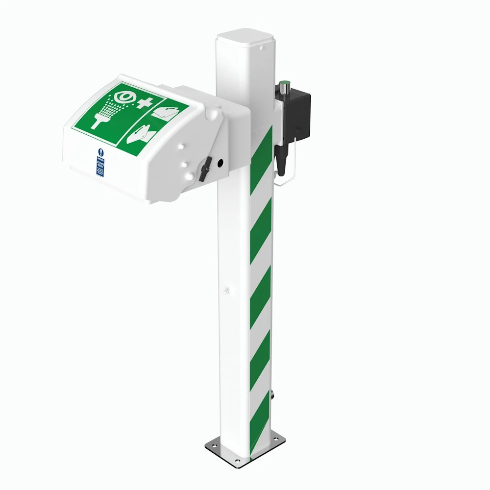 Jalustalle kiinnitetty pakkassuojattu silmä-/kasvojenhuuhteluyksikkö, joka on ihanteellinen kylmiin ilmastoihin. Silmien/kasvojen huuhteluvedessä on suuren virtausnopeuden ilmastetut diffuusorit pesun tehostamiseksi ja vesiventtiiliin yhdistetty kiinteä kansi, joka toimii automaattisesti, kun kansi vedetään alas.