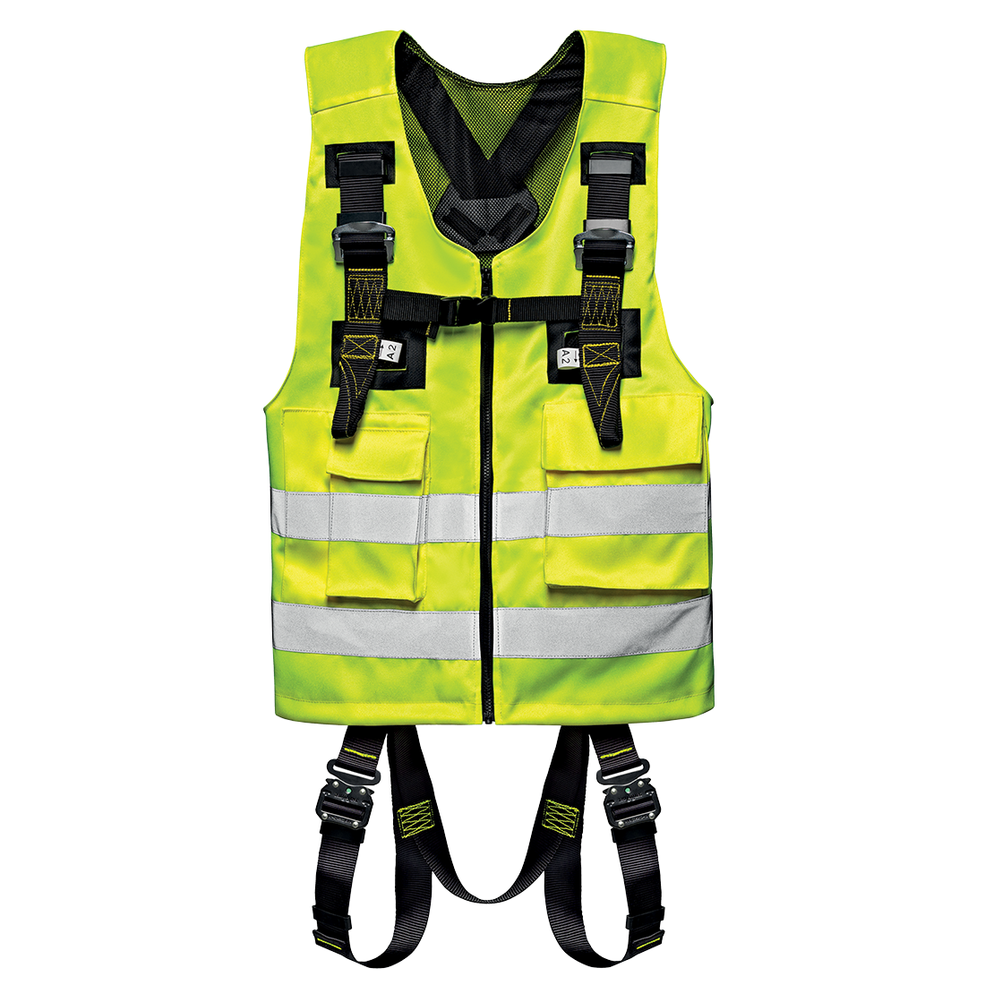hyvin näkyvä keltainen liivi. Varustettu yhdellä selkäpuolen D-kiinnikkeellä ja